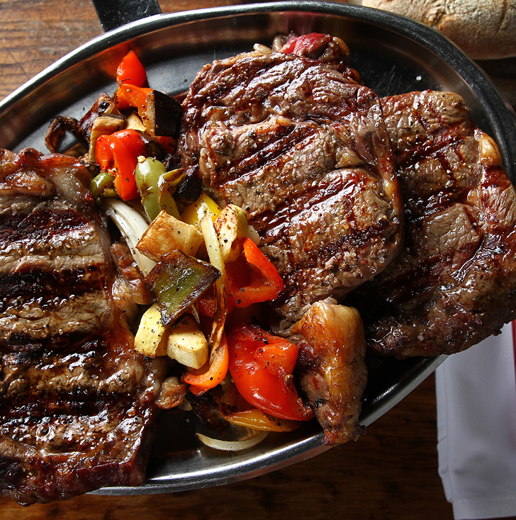 אנטריקוט, אסאדו, ופרגית (או סינטה) בליווי ירקות קלויים וחצאי תפו"א מהגריל
